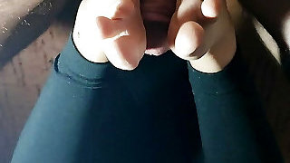 Taut leggins and a swollen, shaved pussy (Faux-cock at the end).