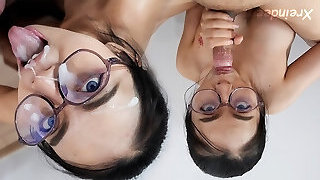 Chinese college girl gets her glasses full of cum after sucking a pecker