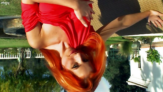 Bright red haired nympho alison tyler juliaan Blounge faps on the deckchair