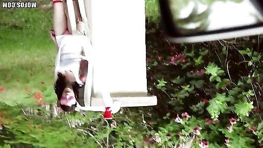 Youthfull ash-blonde screws ebony dude in back yard and eats jizz