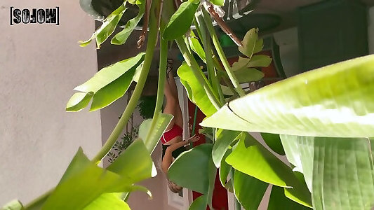 Totally naked gals tease Charles Dera cleaning windows outdoor