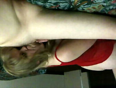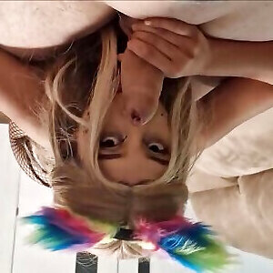 Cute blondie drools all over a huge dick hanging upside down while facefucked