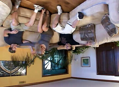 Blonde slut wears black stockings while sucking girls way massge riding a cock on the couch