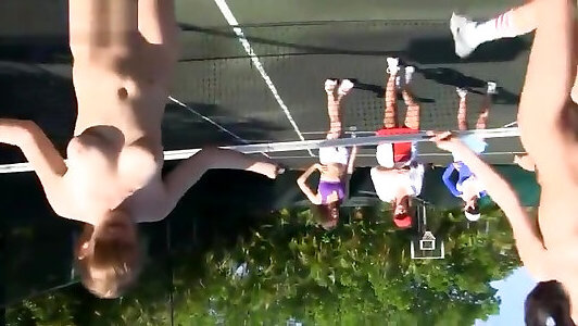 Huge-titted lesbians jerking on the tennis field