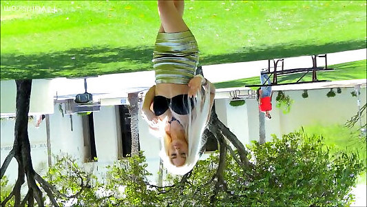 Tempting towheaded dancing seductively at an outdoors swimsuit soiree