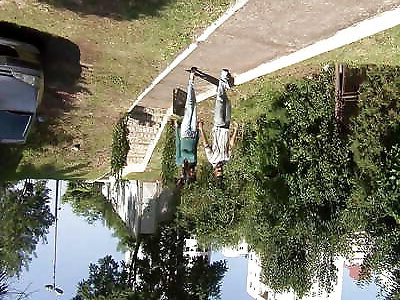 Before going inside to bang the brunette strips outdoors and exposes her big black ass