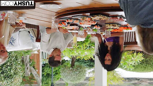 Outdoor asian gang-fuck with naturist models