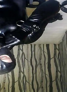 Latex Hooded Damsel Hog Tied in Catsuit and Muzzle Ball-gagged