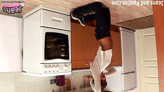 A super-hot housewife in the kitchen gladfully removes homemade shorts and shows lace cut-offs, flirting online on cam with