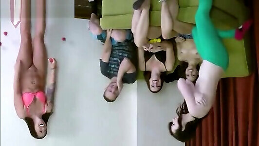 1 man with 4 chicks have fun game of throw the pouch and witness which inserts