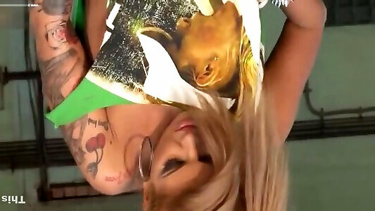 Tattoed brown-haired Becky Stevens fingers gash by a graffity wall
