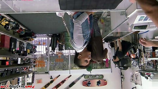 Dark-hued pawnshop stunner fellating pov pipe before leaned over desk