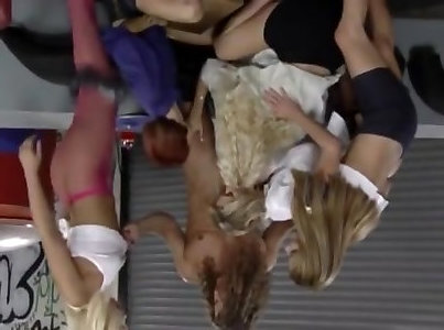Insatiable breezies win a opportunity to blow fleshy lollicocks of strippers in the bar
