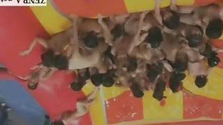 Subtitled huge group of Japanese nudists lube wrestling