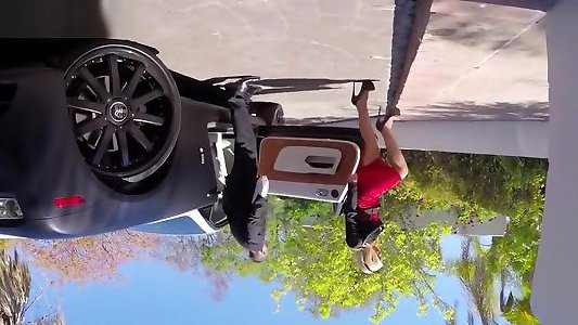 une délicieuse et belle villageoise allemande étire ses jambes sur le capot en spandex de la camionnette